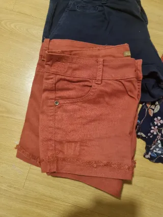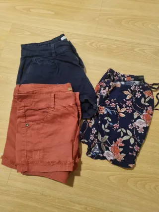 Tres shorts para mujer. - Unos shorts de color azul marino. - Unos shorts de color rojo con detalle deshilachado en el bajo.