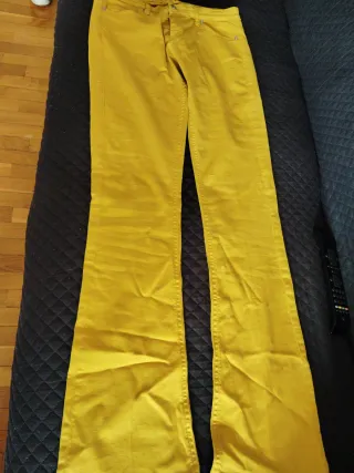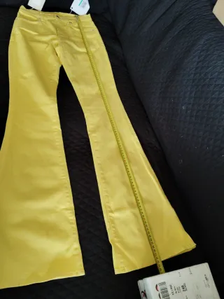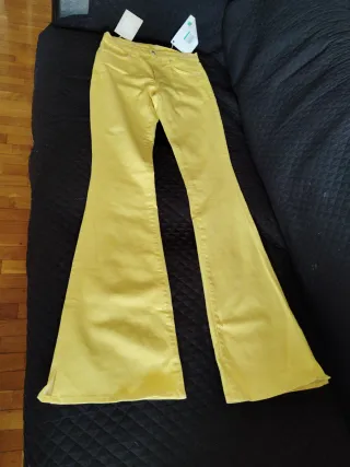 Pantalón de corte campana en color amarillo. Un básico con un toque retro. - Diseño de pierna ancha. - Detalle de abertura en el bajo - Es un amarillo muy bonito. En la foto no consigo que se aprecie. La mas parecida es la segunda. Un amarillo vivo. Precioso ..