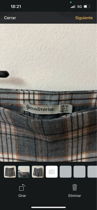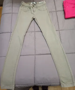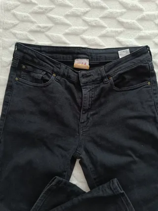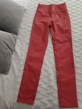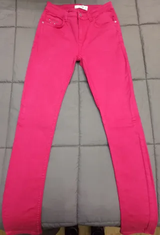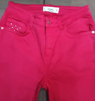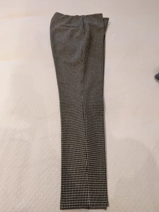 Pantalón de vestir con un diseño de rayas verticales finas. Es la 40 pero talla muy pequeño. Yo diría que es una 36 - Corte recto. - Cintura con trabillas. - Cierre de cremallera y botón. - bolsillos delanteros - super estiloso tanto para sport como arreglada - puesto poco por tema de talla