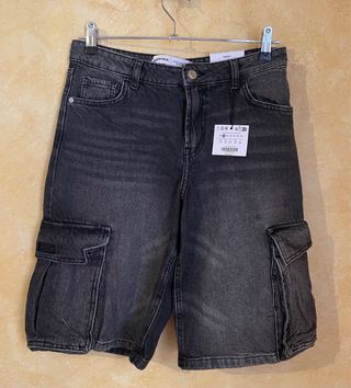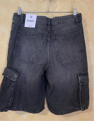 Pantalón vaquero gris corto superbaggy de Bershka. - Corte ancho. - Lavado desgastado. - Cierre de botón y cremallera.