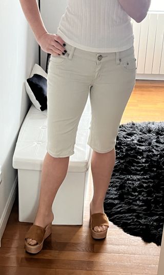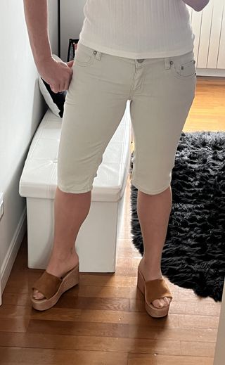 Pantalón vaquero pirata de la marca Morgan. - Corte pirata. - Color beige. - Talla 40.
