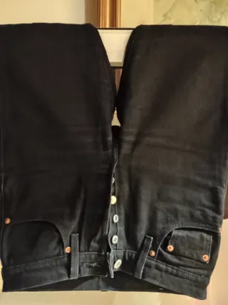 Pantalones vaqueros Levi's 501 para mujer. Cintura 70, cadera 90, largo 96, tiro delante 27 con 5 botones metalicos con logotipo, tiro atrás 36. - Corte skinny ajustado. - Color negro. - Talla 38.