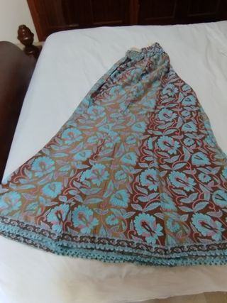 Elegante pantalón ancho de la marca CALOR B.L., talla 44. Es una prenda bonita y cómoda, ideal para el verano. - Diseño estampado con flores en tonos turquesa y marrón. - Tejido ligero y fluido.