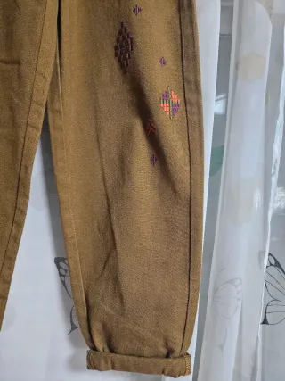 Pantalón de corte recto con detalles bordados. - Diseño con motivos geométricos y zig-zag. - Combinación de hilos en tonos morado, verde, naranja y rosa. - Bolsillo lateral con pespuntes decorativos. - Talle alto. - Bajos del pantalon doblados.