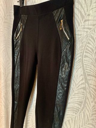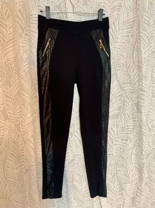 Pantalón tipo legging elástico con detalles de polipiel. - Diseño ajustado. - Cremalleras decorativas en los bolsillos delanteros. - Panel lateral de polipiel con textura. - Cintura elástica para mayor comodidad.