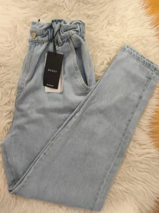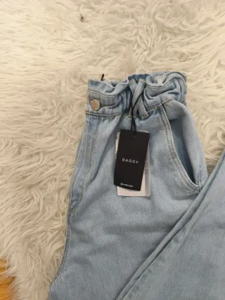 Pantalón vaquero de Stradivarius, con un diseño moderno y cómodo. - Estilo baggy o holgado. - Cintura elástica con detalle fruncido. - Cierre de botón y cremallera. - Bolsillos delanteros y traseros.