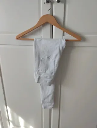 Pantalón pitillo en color blanco, de tiro alto que estiliza la figura y tejido muy elástico que se adapta perfectamente al cuerpo. Corte ajustado tipo skinny, ideal para cualquier look. ✨ Características: • Corte pitillo / skinny • Tiro alto • Tejido elástico y cómodo • Color blanco muy combinable Perfecto para combinar con camisetas, blusas, tops o jerseys. Ideal para looks casual o más arreglados, primavera-verano o entretiempo. 📏 Talla: S / 36 📦 Estado: muy buen estado 💬 Si quieres más fotos o medidas, escríbeme sin problema. 📦 También hago packs de ropa con descuento si te interesa.