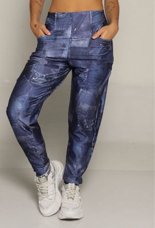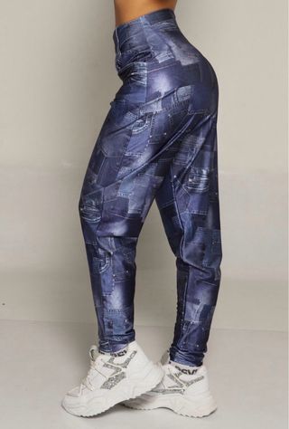 Pantalón de la marca Body Sculpt. Talle M / 40. Tambien sirve para un talle S ( dado que la tela se amolda al cuerpo ) - Diseño estampado de parches en color azul, blanco y negro. - Corte ajustado en cintura , un poco ancho y termina mas achupinado. - Cintura alta. - Tiene un ligero brillo que lo hace elegante y versatil para cualquier ocasion - Tela super liviana y fresca para la primavera / Verano