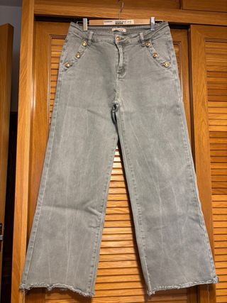 Pantalón vaquero de corte ancho para mujer. Presenta un diseño de tiro alto con doble hilera de botones dorados en la parte frontal. - Tejido vaquero. - Tiro alto. - Cierre con cremallera.