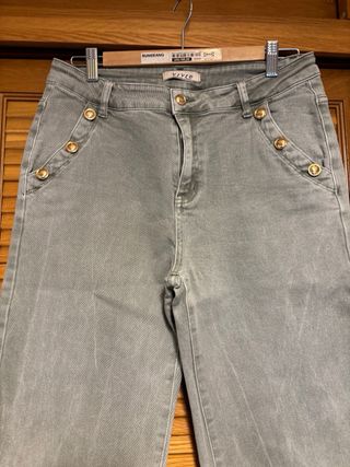 Pantalón vaquero de corte ajustado. - Detalle de tachuelas doradas en los bolsillos. - Cremalleras decorativas en los bolsillos delanteros. - Cierre de botón y cremallera.