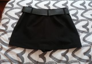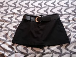 Falda pantalon mini en color negra de tiro medio y cintura con cinturon extraible. Cierre lateral con cremallera oculta en la costura y forro interior tipo shorts. Mide de cintura 39cm y de largo 33cm. Esta nueva sin haber sido estrenada nunca.