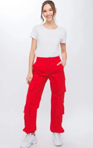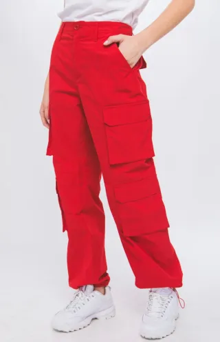Pantalón cargo de color rojo, estilo moderno y cómodo. - Diseño con múltiples bolsillos. - Cintura con cierre de botón y cremallera.