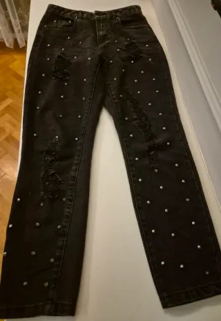 Pantalones vaqueros negros con un diseño único. - Decorados con tachuelas plateadas. - Detalle de rotos y desgastados.