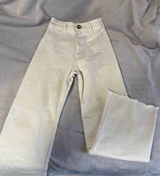 Pantalón ancho de mujer, talla 42. Un básico versátil para tu armario. - Diseño de pierna ancha. - Detalle de botones dorados en la cintura. - Bajo deshilachado. Sin roturas, ni manchas