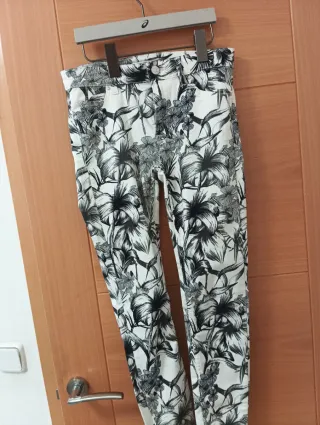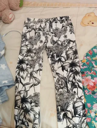 Pantalón de Zara con un llamativo estampado floral en blanco y negro. Su corte ajustado lo hace muy favorecedor. - Diseño con flores y hojas. - Cintura alta.