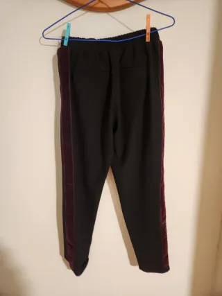 Pantalón de vestir negro de Zara con un toque deportivo. - Raya lateral en color dorado y blanco. - Corte recto. - Cintura alta.