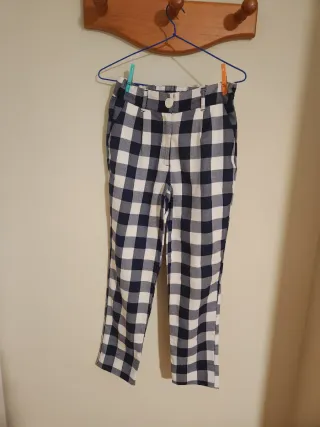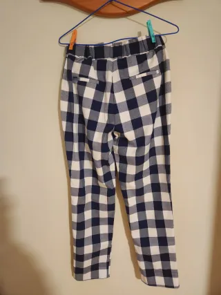 Conjunto de pantalones de mujer en diferentes colores y estampados. - Pantalón rosa liso Bershka xs. - Pantalón blanco con botones bershka 34. - Pantalón gris liso zara basic xs. - Pantalón de cuadros blanco y negro spingfield xs. - Pantalón cuadro rojo y negro zara s.