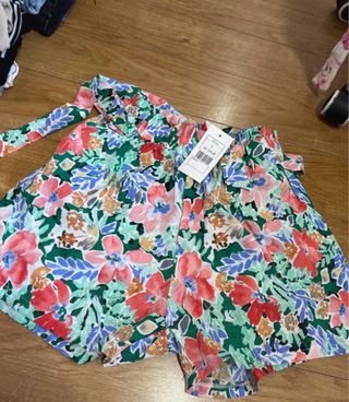 Pantalón corto con estampado floral vibrante. Perfecto para un look veraniego. - Cintura elástica con cinturón. - Diseño de flores en multicolor sobre fondo verde.