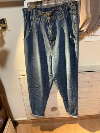 Pantalón vaquero de corte ancho. - Cintura con cordón ajustable. - Bolsillos laterales. - Piernas rectas y amplias.