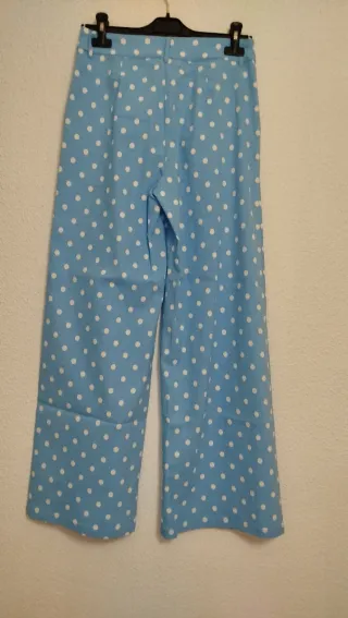 Pantalón de corte culotte con un diseño de lunares blancos sobre fondo azul. Confeccionado en un tejido ligero, es ideal para climas cálidos. - Corte culotte. - Estampado de lunares. - Tejido ligero.