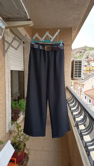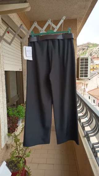 Pantalón negro de corte ancho, con la etiqueta puesta. Cintura engomada que le aporta mayor comodidad. Sirve para una talla 42 ó 44. - Cinturón con hebilla dorada incluido. - Tejido de poliéstery elastan.