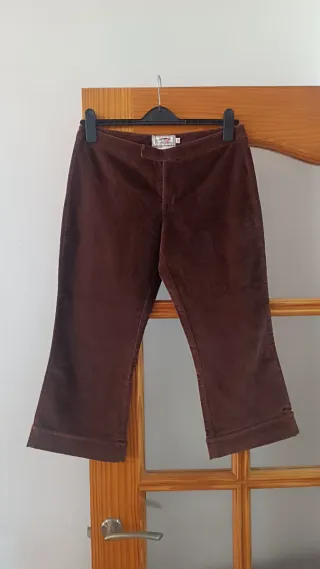 Pantalones de pana en color marrón. Tienen un corte acampanado y un diseño moderno , cierre con cremallera y botón , lleva un bolsillo en cada lateral , muy bonitos , como nuevos , para ese tiempo . - Material: tejido tipo pana , algodón y elasthan - Color: Marrón - Corte: Acampanado