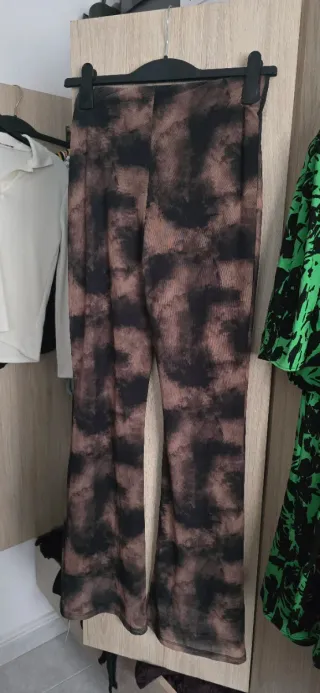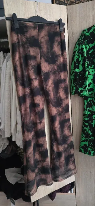 Pantalones acampanados con un llamativo estampado. - Diseño de corte acampanado. - Estampado abstracto en tonos marrones y negros. Talla s/m