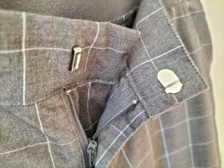 Pantalón de vestir para mujer con un diseño de cuadros clásico. En color gris y lineas blancas. Dos bolsillos delanteros. Y para cerrar corchete y cremallera. Los dos bolsillos traseros son decorativos. Tela comoda y suave. La parte trasera de cintura tiene elástico por lo que se ajusta muy bien. Cintura 38cm ( sin estirar elástico) Largo 94 cm