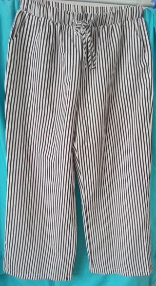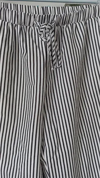 Pantalón de rayas verticales con cintura elástica y cordón. Mide de cintura 43cm. Ancho de cadera 63cm. Ancho de pierna 30cm. De largo 1;05cm - Diseño de rayas blancas y negras. - Cintura con elástico. - Detalle de cordón en la cintura. - Bolsillos laterales.