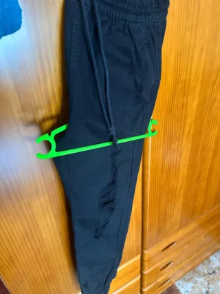 Pantalón negro de estilo moderno tipo jogger. - Cintura con cordón ajustable. - Detalle de rotos en la pierna. - Talla S
