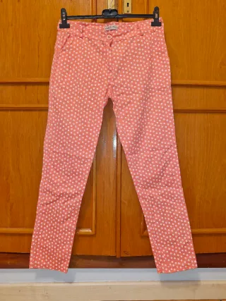 Pantalón chino de corte recto con un alegre estampado de flores blancas sobre fondo naranja. Ideal para un look casual y fresco. - Estampado floral. - Cierre de botón y cremallera. - Bolsillos laterales.