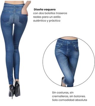 Conjunto de tres jeggings con un diseño que imita el estilo vaquero. Son cómodos y versátiles. - Diseño tipo jeans. - Cintura elástica. - Tacto suave. Colores azul,gris y negro.