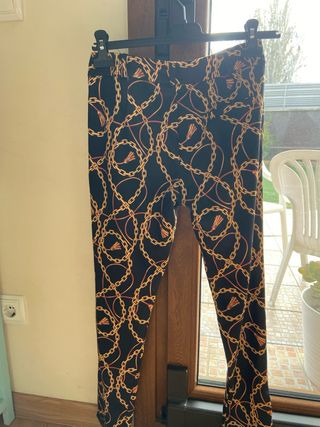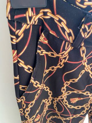 Pantalones con un llamativo estampado de cadenas doradas sobre fondo negro. Son cómodos y versátiles. - Diseño de cadenas doradas y detalles en tono rojizo. - Cintura elástica para un ajuste cómodo.