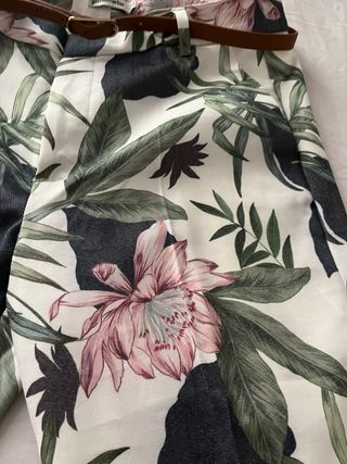 Pantalón de vestir con un llamativo estampado floral. - Diseño con flores y hojas verdes. - Cinturón marrón incluido. - Tejido elástico.