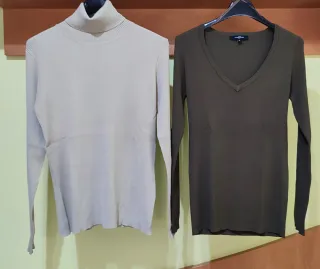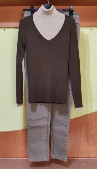 Conjunto de jersey de cuello alto y jersey de pico, combinado con pantalón. - Jersey de cuello alto talla G marca Visto Bueno, en color beige.; 4€ - Jersey de pico Talla marca Visto Bueno, en color caqui 4€ - Pantalón stretch Talla 40 marca TEX woman, en tono similar al jersey de pico. 10€ - Se pueden vender sueltos. Todo está sin estrenar. Los jerseys son elásticos. El pantalón aún conserva las etiquetas.