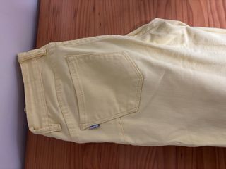 Pantalón vaquero de corte recto con un llamativo color amarillo. - Cintura alta. - Cierre de cremallera y botón. - Bolsillos delanteros y traseros. - Bajo deshilachado. - Perfecto estado, solo tiene un pequeño descocido en el costado de la pierna.