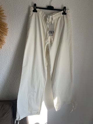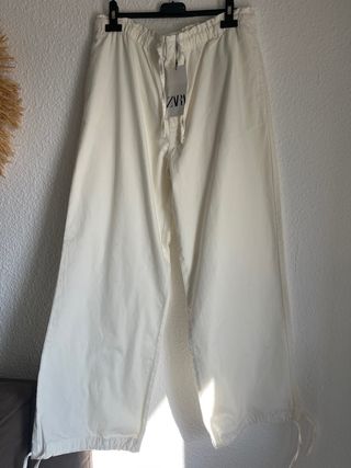 Pantalón de Zara de corte ancho y color blanco. Presenta cintura elástica con cordón ajustable y bajos con cordón para fruncir. - Cintura elástica. - Cordón ajustable en cintura y bajos. - Bolsillos laterales.