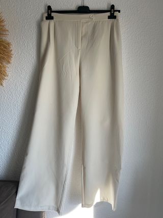 Pantalón de corte ancho en color beige. Diseño elegante y versátil. Solo una puesta - Cintura con cierre de botón y cremallera. - Bolsillos laterales. - Pierna ancha.