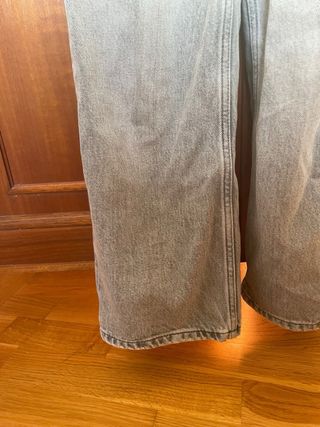 Pantalón de jean estilo desgastado con un corte moderno. - Tiro alto. - Pierna ancha. - Bajo deshilachado. - En perfecto estado, solo tiene unas pequeñas manchas blancas de salpicadura pero apenas se notan.