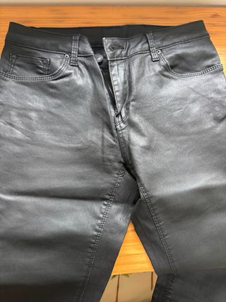 Pantalón de efecto cuero con un corte acampanado. - Diseño de tiro alto. - Cierre con cremallera y botón. - Bolsillos delanteros y traseros.
