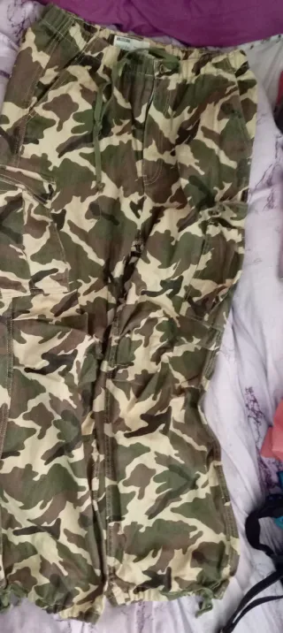 Pantalones cargo de camuflaje de la marca Bershka. Son cómodos y prácticos. - Estampado de camuflaje. - Cintura elástica con cordón. - Bolsillos cargo laterales. - Bajo ajustable con cordón.