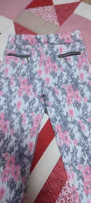 Pantalón de corte ajustado con estampado floral en tonos grises y rosas. Presenta dos bolsillos delanteros con cremallera. - Diseño floral. - Dos bolsillos con cremallera.