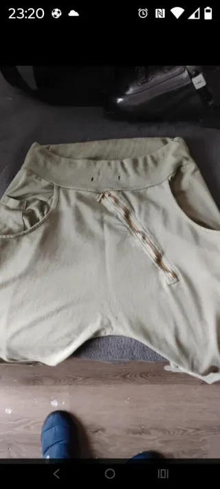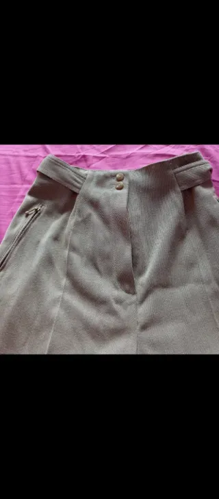 Pantalón corto de tejido ideal para el invierno. Presenta un diseño moderno y cómodo. Pantalón corto de mujer, tejido fuerte para usar en invierno , con tirillas con botones en la cintura, dos botones delanteros, dos bolsillos con cremallera. Talla 42, marca El Corte Inglés Solo se pudo usar una vez, está en perfecto estado, es un color verdoso beis. Las medidas están en las fotos - Tejido de invierno. - Cinturón a juego. - Bolsillos con cremallera.