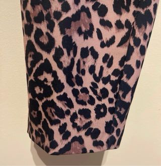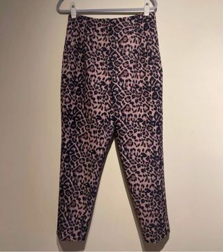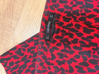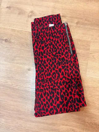 Pantalón de Zara con estampado de leopardo. - Diseño con cremallera lateral. - Patrón llamativo en rojo y negro.