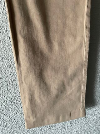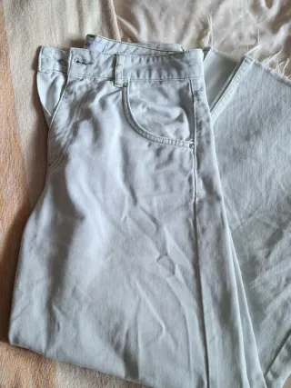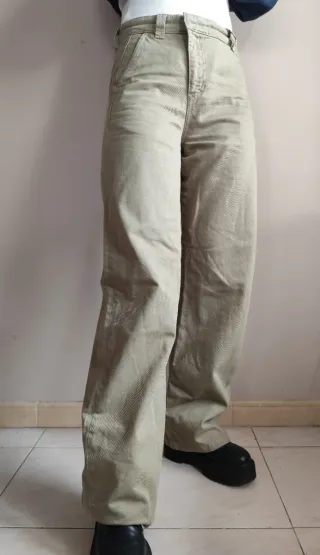 Pantalón de corte recto y estilo casual. El color es verde caqui, verde muy clarito aunque parezca beige - Cierre de cremallera , botón y enganche en el interior cruzado -Tiro alto