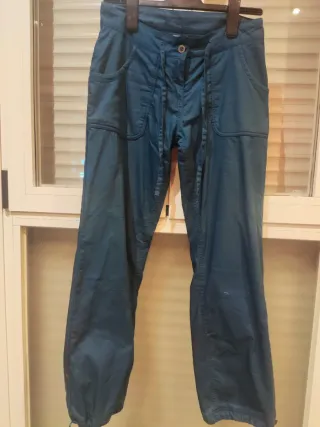 Pantalon marrón de loneta, talla 34 (equivalencia a una 38) bastante usado, el final del mismo esta abierto en los laterales, bien conservado aunque ha perdido el marrón intenso. En perfecto uso.