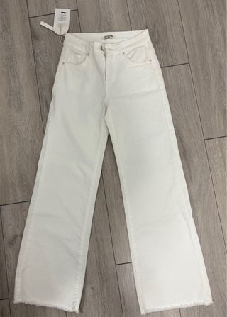 Pantalones blancos de corte recto, sin estrenar y con etiqueta. - Talla S (equivalente a 36). - Diseño de pierna ancha. - Bajo deshilachado.