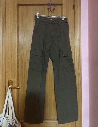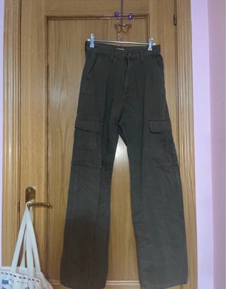 Pantalones cargo de color verde militar, usados en varias ocasiones. - Diseño con múltiples bolsillos. - Corte recto y holgado.