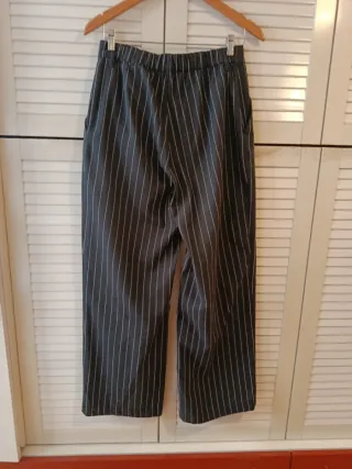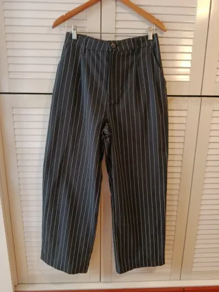 Pantalones de vestir H&M con un diseño clásico de pinzas. El tejido presenta un patrón de rayas verticales finas que añaden un toque elegante. - Diseño de rayas verticales. - Cintura con trabillas para cinturón y goma en la parte de atrás - Cierre de botón y cremallera.