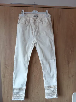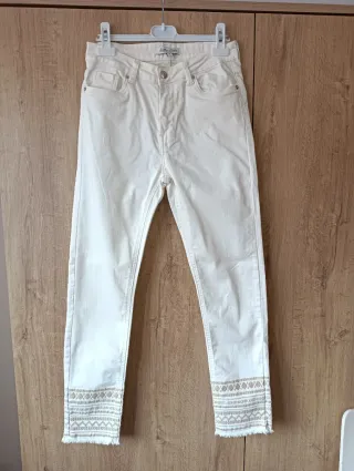 Pantalones vaqueros de color blanco roto con un diseño único. - Detalle de bordado étnico en los bajos. - Corte ajustado. - Bajo deshilachado.